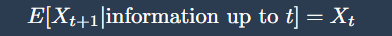 Suppose we denote your wealth at a given time t by Xt. The question is then: based on everything you know up to now, what is the best prediction of your wealth tomorrow? In a fair game, the answer is obvious: it is simply your current wealth. The game contains no hidden tricks or patterns that can systematically help you win. Mathematically, we write this as: