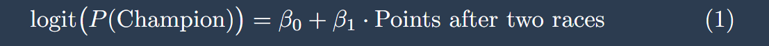 To analyse the results of the first two races, I collected data from 2010-2025. For each driver-season observation, the dataset contains the finishing position and points scored in the first two races, as well as the final championship result. Sprint races are excluded from the analysis, since only one sprint weekend occurred in the entire dataset and the impact on points scored is relatively small. Using this dataset, we estimate how results of the first two races affect the probability of becoming world champion.