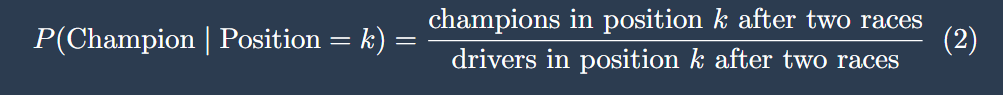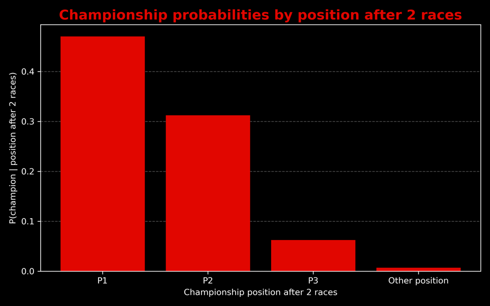 Looking at the graph we can see that the probability of becoming champion drops sharply in position after two races. More than 75% of championships were won by drivers who were first or second in the standings after two races, and lower positions have far lower probabilities.