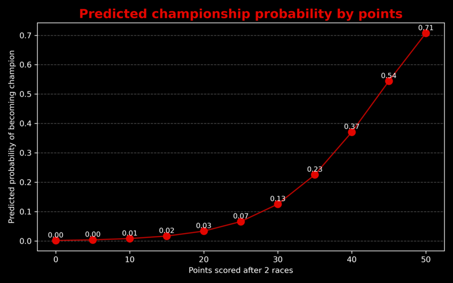 The model estimates the impact of points scored in the first two races on the probability of becoming world champion. The relationship is strongly increasing. A driver who scores the maximum of 50 points in the first two races has a 71% chance of becoming world champion. In contrast, fewer points make the probability drop quickly. Having two strong race results can hardly be a coincidence, and this indicates that both the driver and the car are capable of competing.